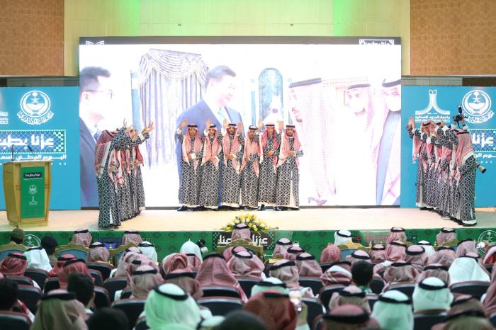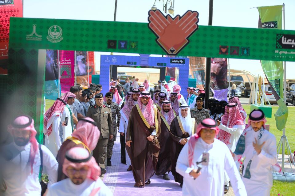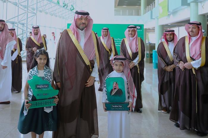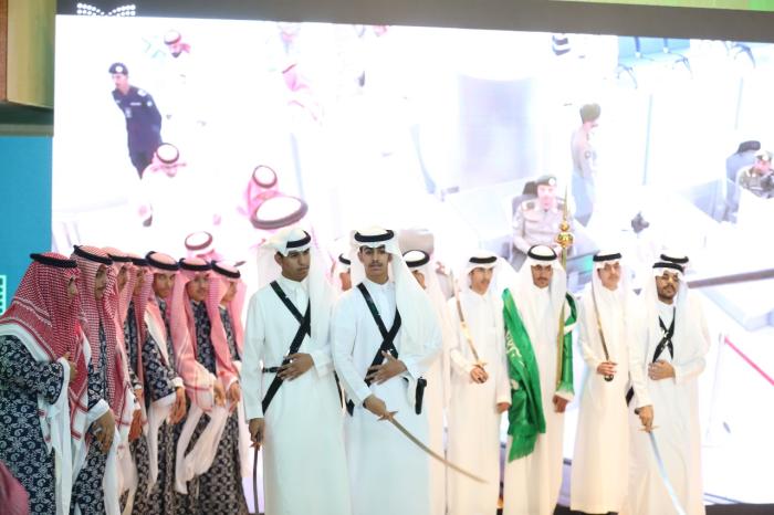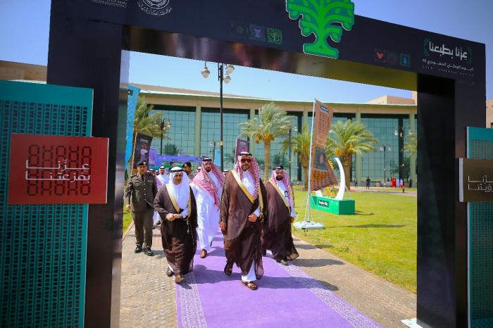 وعند  دخول موكب سموه بوابة الجامعة  أحاط به الطلاب والطالبات من كافة مراحل التعليم مرحبين بسموه ــ  تعبيرًا عن الحب والولاء للقيادة الرشيدة ــ، حتى وصوله إلى موقع الحفل، حيث كان في استقبال سموه سعادة رئيس الجامعة الأستاذ الدكتور أحمد بن علي الرميح، ومدير الإدارة العامة للتعليم بالمنطقة الأستاذ سعيد بن مساعد الزهراني ومديرالإدارة العامة للتدريب التقني والمهني بالمنطقة المهندس حسن بن علي السليم، وفي طريقه للوصول إلى مقر الحفل افتتح سموه المعرض المصاحب للحفل والذي يحكي قصة التطور والتقدم عبر مراحل قيام المملكة العربية السعودية، واشتمل على جناح:  التوحيد والذي يحكي ملاحم الملك عبد العزيز إلى عهد الازدهار، عبر تقنية الواقع الافتراضي     VR     وجناح تسلسل الأحداث للملك المؤسس بالتعاون مع دارة الملك عبد العزيز، والجناح الرقمي جذور الماضي وآفاق المستقبل، وجناح العالم في رحاب لوطن للطلبة الدوليين في الجامعة، وجناح التعليم للفن التشكيلي، وجناح الإدارة العامة للتدريب التقني والمهني، بالإضافة للمعرض الرقمي لملوك المملكة العربية السعودية حيث استمع سموه خلال تفقده لها إلى ملحمة توحيد المملكة، واطلع على جانب من إبداعات الطلبة وتصاميمهم ومنتجاتهم العلمية والبحثية والعملية، حيث عبرت الأجنحة المشاركة في المعرض عن نهضة وتطور التعليم ومراحله في المملكة خلال عقود من العمل أفضت إلى التقدم والازدهار والنهضة التي تشهدها المملكة على مستوى التعليم العام والجامعي والمهني، وصولًا إلى تحقيق مستهدفات رؤية المملكة المباركة 2030.