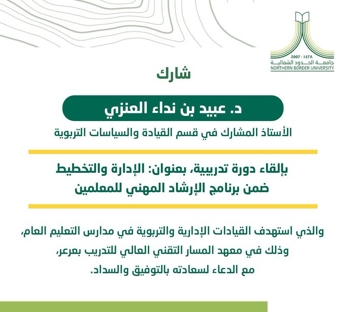 وشكر جامعة الحدود الشمالية ومنظمي اللقاء مبينا أهمية إدراك الطلبة لأهمية معرفة ظروف العمل وقراءة مستقبل السوق والمحركات والتطورات التي تؤثر في واقع أسواق العمل، مبينا أهمية التدريب، ومؤكدا على أن التدريب من أهم محاور رؤية المملكة ٢٠٣٠ للاقتصاد المزدهر والمستقر.
