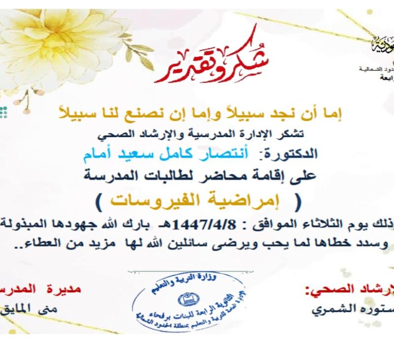 خدمة مجتمعية بمدرسة الثانوية الربعة برفحاء (محاضرة تثقيفية عن امراضية الفيروسات)