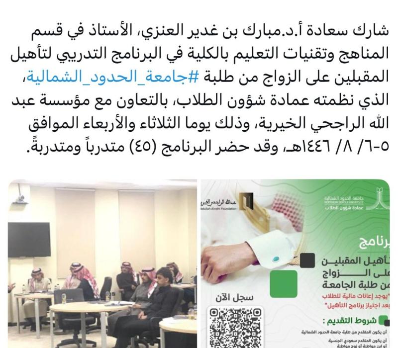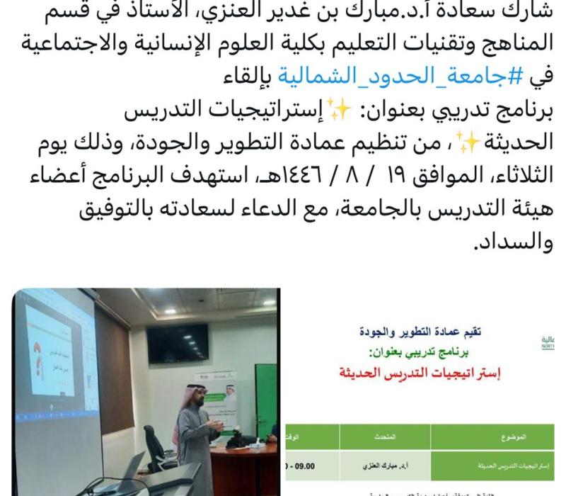 شارك سعادة أ.د.مبارك بن غدير العنزي، الأستاذ في قسم المناهج وتقنيات التعليم بكلية العلوم الإنسانية والاجتماعية في جامعة الحدود الشمالية بتقديم برنامج تدريبي بعنوان: إستراتيجيات التدريس الحديثة،...