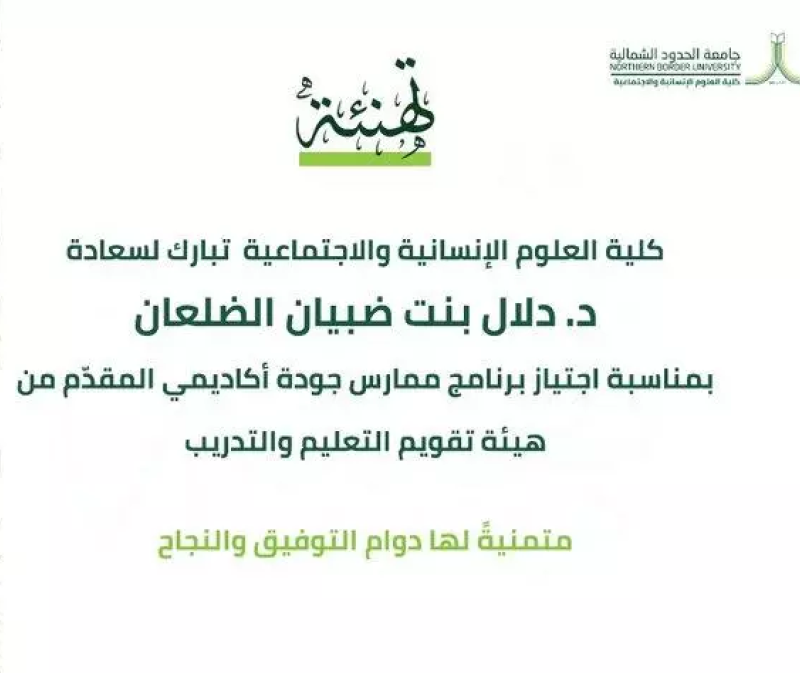 حصلت د. دلال ضبيان الضلعان على شهادة ممارس جودة أكاديمي من هيئة تقويم التعليم والتدريب